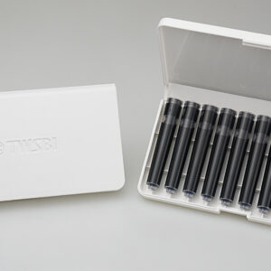 Universal snap-in cartridges for fountain pens, fountain pen rollers, and glass pens. 6 cartridges are neatly and securely packed in a cylindrical metal tin.