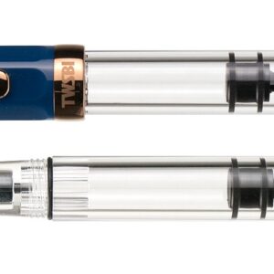 The TWSBI ECO fountain pen boasts an incredible value with its piston filling system and affordable price. Like many other TWSBI fountain pens, it features a crystal clear acrylic barrel so you can see your ink level, and an opaque indigo blue cap and finial. The pen cap has an inner cap to ensure a perfect seal when stored away. It is completed with bronze trim and a bronze-colored stainless steel nib.